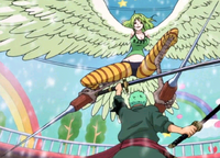 Monet wielded a pair of gigantic water ice picks, which she used by holding them with her clawed feet, and was capable of clashing with Zoro, who was an accomplished swordsman (Though, it should be noted that Zoro was holding back). In the anime, they were composed of snow, and reverted dorsum into snow when she was defeated.[26]